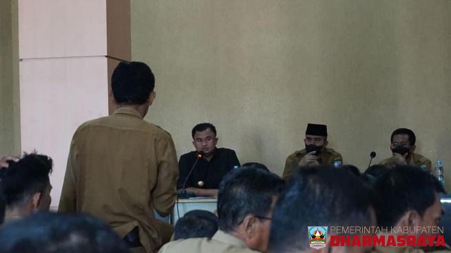 Dharmasraya - Bupati Dharmasraya, Sutan Riska Tuanku Kerajaan, diwakili Sekretaris Daerah, Adlisman, buka kegiatan sosialisasi Surat Ederan (SE) Bupati tentang Peran Pemerintah Nagari Dalam Pengolahan Sampah, di Ruang Kerja Aula Lantai II Kantor Bupati, Senin (18/7/2022).Sosialisasi Surat Edaran Bup...