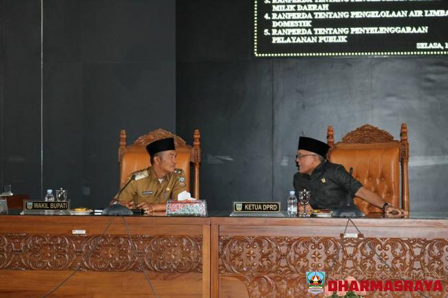 DHARMASRAYA - Wakil Bupati Dharmasraya, H.Amrizal Dt Rajo Medan, mendengarkan pandangan umum fraksi DPRD, terkait Nota Penjelasan terhadap lima Rancangan Peraturan Daerah (Ranperda) yang disampaikan oleh Bupati Dharmasraya, Sutan Riska Tuanku Kerajaan, Senin (09/04) kemarin. Pandangan Umum Fra...