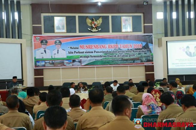 DHARMASRAYA -- Bupati Dharmasraya, Sutan Riska Tuanku Kerajaan, membuka secara resmi Musrenbang RKPD (Rencana Kerja Pembangunan Daerah) tahun 2019, di Auditorium Dharmasraya, Selasa (27/03). Kegiatan yang diikuti oleh seluruh perangkat daerah, camat, wali nagari dan stakeholder lainnya itu turut dih...