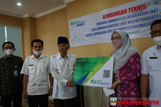 DHARMASRAYA -- Wabup Dharmasraya, Dasril Panin Dt. Labuan menghadiri acara bimbingan teknis program Jaminan Kerja (JKK) dan Jaminan Kematian (JKM) BPJS Ketenagakerjaan kepada bendahara OPD se-Kabupaten Dharmasraya. Sekaligus menyerahkan pembayaran santunan program kematian (JKM) sebesar Rp.42 juta d...