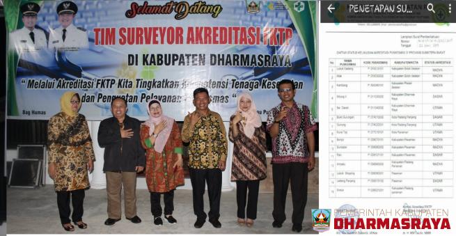 Dharmasraya,- Sebanyak dua Pusat Kesehatan Masyarakat (Puskesmas) di Kabupaten Dharmasraya dinyatakan lulus oleh Komisi Akreditasi Fasilitas Kesehatan Tingkat Pertama (FKTP), yaitu Puskesmas Sungai Dareh dan Puskesmas Sitiung 2.Kepala Dinas Kesehatan Kabupaten Dharmasraya, Rahmadian melalui Kabid Pe...