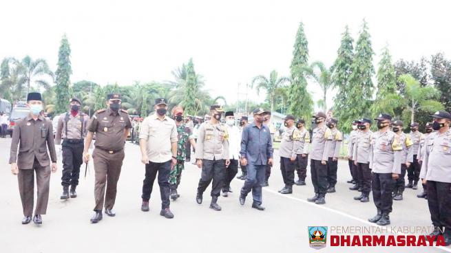 DHARMASRAYA - Polres Dharmasraya bekerjasama dengan Pemerintah Kabupaten Dharmasraya menggelar Apel Gelar Pasukan Operasi Lilin Singgalang 2021, di Halaman Kantor Bupati Dharmasraya, Kamis (23/12/21). Operasi Lilin dalam rangka pengamanan Natal dan Tahun Baru ini dipimpin oleh Bupati Dharmasraya, Su...