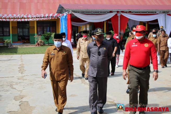 DHARMASRAYA - Bupati Dharmasraya, Sutan Riska Tuanku Kerajaan yang diwakili Sekretaris Daerah, Adlisman, meninjau pelaksanaan Vakinasi Massal Lanjutan bagi Pelajar dan Santri, di SMA Negeri 2 Pulau Punjung, Selasa (12/10/21). Peninjauan ini dilakukan bersama unsur Forkopimda dan Badan Intelijen Daer...