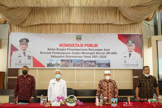 DHARMASRAYA - Pemerintah Kabupaten Dharmasraya menggelar Konsultasi Publik untuk penyempurnaan Rancangan Awal RPJMD (Rencana Pembangunan Jangka Menengah Daerah) Tahun 2021-2026, di Auditorium Kantor Bupati Dharmasraya, Kamis (8/4/21). Hadir dalam kesempatan itu unsur pemerintah daerah, Tim Ahli RPJM...