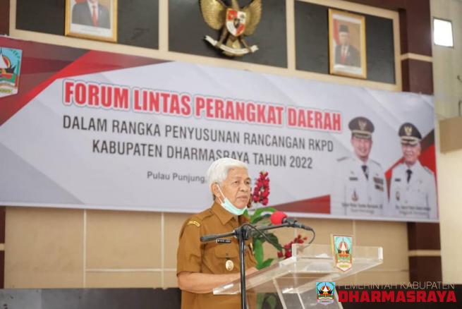 DHARMASRAYA - Wakil Bupati Dharmasraya, DP Datuk Labuan, membuka secara resmi Forum Lintas Perangkat Daerah dalam rangka Penyusunan Rencana Kerja Pemerintah Daerah (RKPD) Kabupaten Dharmasraya Tahun 2022, di Auditorium Kantor Bupati Dharmasraya, Selasa (16/03/21). Kegiatan yang difasilitasi oleh Bap...
