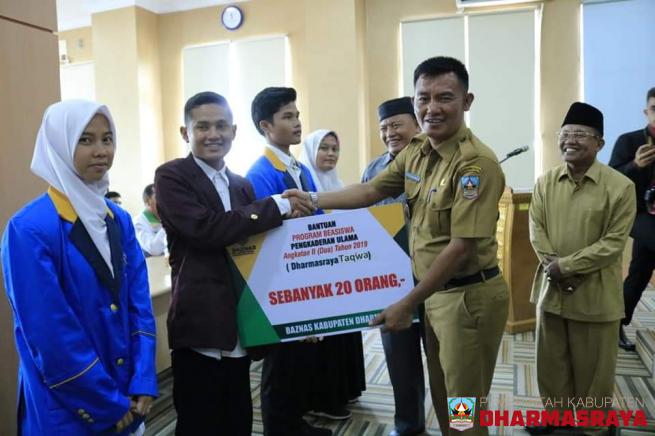 Dharmasraya---Pemerintah Kabupaten Dharmasraya bekerjasama dengan Badan Amil Zakat Nasional (Baznas) kembali menyalurkan beasiswa program Satu Keluarga Satu Sarjana (SKSS) dan Kader Ulama kepada 51 orang mahasiswa di Kabupaten Dharmasraya. Penyerahan beasiswa ini dilakukan oleh Wakil Bupati Dharmasr...
