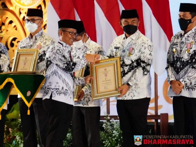 Dharmasraya, Bupati Dharmasraya Sutan Riska Tuanku Kerajaan menerima penghargaan Dwija Praja Nugraha dari Pengurus Besar Persatuan Guru Republik Indonesia (PB PGRI) sebagai bentuk komitmen kepala daerah dalam mendukung pendidikan.Penghargaan tersebut diserahkan langsung Presiden Joko Widodo di Semar...