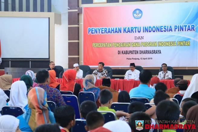 Bupati Dharmasraya, Sutan Riska Tuanku Kerajaan, menyerahkan secara simbolis Kartu Indonesia Pintar (KIP) kepada 200 pelajar di Dharmasraya, yang berasal dari jenjang pendidikan SD, SMP dan SMA, Jum'at (12/04). Penyerahan yang dilakukan di Gedung Auditorium Dharmasraya itu turut disaksikan oleh seju...