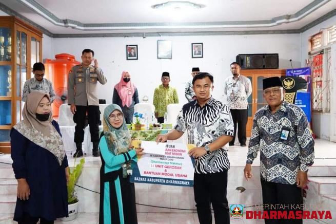 DHARMASRAYA -- Bupati Dharmasraya, Sutan Riska Tuanku Kerajaan, salurkan zakat bantuan pemberdayaan ekonomi masyarakat miskin, berupa 11 unit gerobak, modal usaha dan bantuan biaya berobat dan tunggakan BPJS kepada sejumlah Mustahik, di gedung Pertemuan Kantor Wali Nagari Sungai Rumbai, Kamis, (06/...
