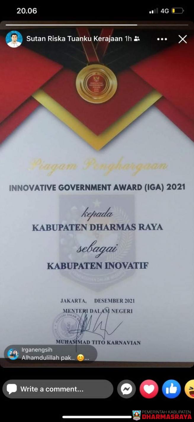 Pemerintah Kabupaten Dharmasraya, di bawah kepemimpinan Bupati Sutan Riska Tuanku Kerajaan, kembali menorehkan prestasi tingkat nasional. Adapun penghargaan yang diterima kali ini adalah Inovatif Government Award (IGA) 2021 dari Kementerian Dalam Negeri. Penghargaan tersebut diterima Kabupat...