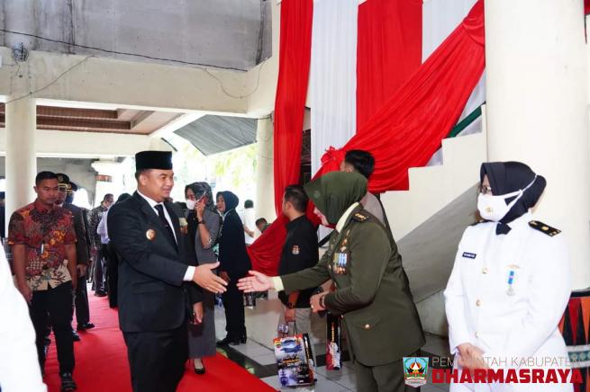 Bupati Dharmasraya, Sutan Riska Tuanku Kerajaan, bersama Ketua DPRD Dharmasraya, Pariyanto, Dandim 0310/SSD, Letkol Andik Hendra Sandi, dan Kapolres Dharmasraya, AKBP Nurhadiansyah, hadiri Upacara Peringatan Hari Ulang Tahun (HUT) Tentara Nasional Indonesia (TNI) ke 77 di Lapangan Imam Bonjol, Padan...