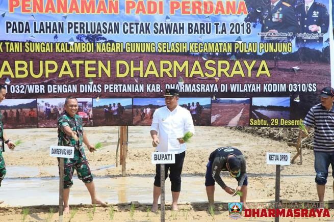 DHARMASRAYA - Bupati Dharmasraya, Sutan Riska Tuanku Kerajaan bersama Komandan Korem 032 Wirabraja, Brigjen TNI Mirza Agus, melakukan tanam padi perdana di lokasi cetak sawah baru di Jorong Kampung Surau, Nagari Gunung Selasih, Kecamatan Pulau Punjung, Sabtu (29/10).Bupati, pada kesempatan itu menga...