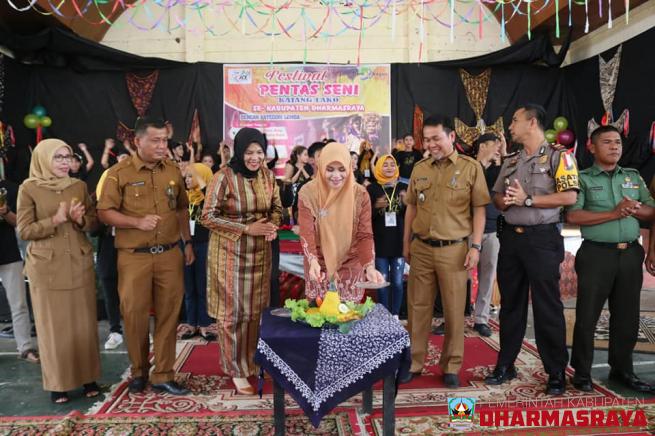 DHARMASRAYA - Festival Pentas Seni Anak Nagari yang diprakarsai oleh Sanggar Kajang Lako dan Pemerintah Kecamatan Koto Baru resmi dibuka oleh Ketua Dekranasda Kabupaten Dharmasraya, Ny. Dewi Sutan Riska, Selasa (18/12). Ditandai dengan pemotongan tumpeng oleh Ketua Dekranasda, pembukaan pentas seni ...