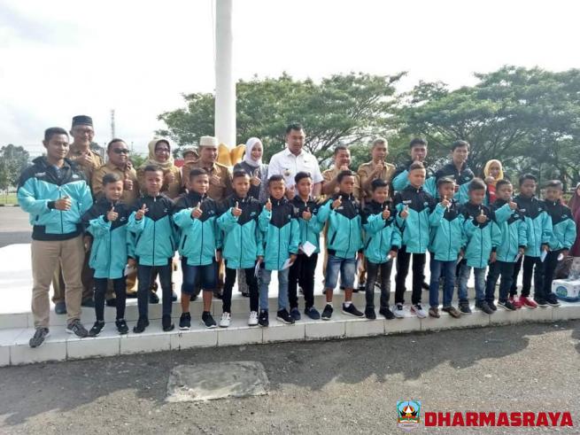 DHARMASRAYA - Bupati Dharmasraya, Sutan Riska Tuanku Kerajaan, melepas secara resmi tim sepakbola U-12 SSB Bintang Muda Junior, di Halaman Kantor Bupati Dharmasraya, Senin (20/08). Para pemain sepakbola muda terbaik ini akan berlaga di Liga Junior yang akan dilaksanakan di Kota Semarang pada 24-26 A...