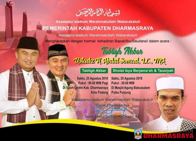 Pendakwah kondang, Ustadz Abdul Somad (UAS) sudah dipastikan hadir untuk mengisi acara Tabligh Akbar yang diselenggarakan Pemerintah Kabupaten Dharmasraya di Sport Center Koto Padang, 25 Agustus mendatang.Sekaitan dengan itu, Bupati Dharmasraya, Sutan Riska Tuanku Kerajaan menginstruksikan kepada se...